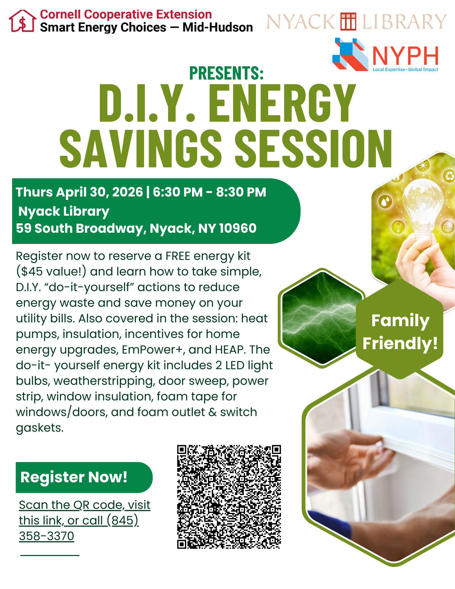 Learn about energy efficiency basics from the Cornell Cooperative Extension Rockland County's Smart Energy Choices Initiative. Each participant receives a free energy kit. Kit value is $45.
