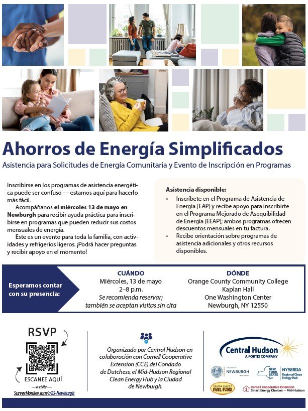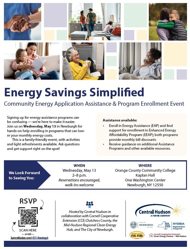 Orange: Energy Savings Simplified Community Energy Enrollment Event Wednesday, May 13, 2026 2:00 PM 6:00 PM 14:00 18:00 Orange County Community College Kaplan Hall 1 Washington Center Newburgh, NY 12550 United States (map) Google Calendar ICS